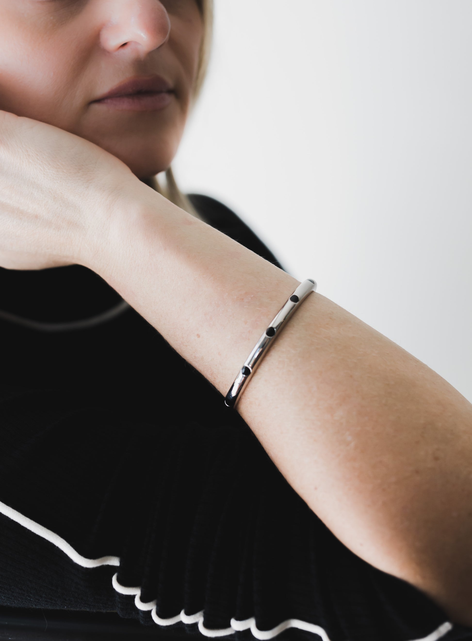 The Who You Are Cuff brings playful sophistication to your jewelry collection. Featuring a sleek, polished silhouette accented with bold black enamel dots, it’s the perfect blend of timeless style and subtle edge. Wear it solo or stack it to elevate your everyday look.